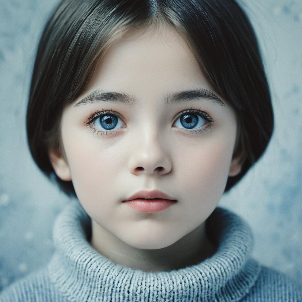 Portrait of a child styled with Modigliani's distinct elongated features. Incorporates a cool winter blues and soft whites and a textured background. The composition focuses on a close-up of the child’s face, emphasizing almond-shaped eyes and simplified forms.