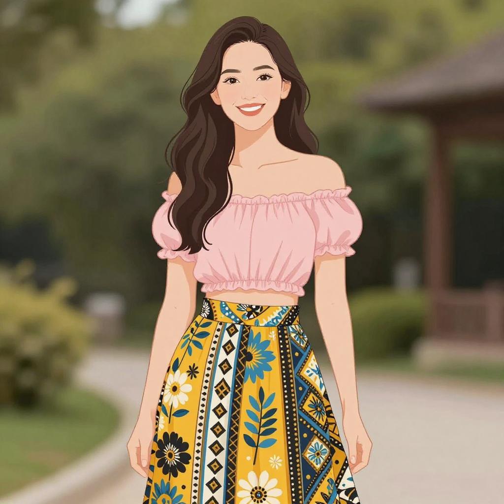 Digital anime-style drawing of a smiling young woman with long dark hair, wearing a strapless black floral top and red skirt, walking on a sunlit