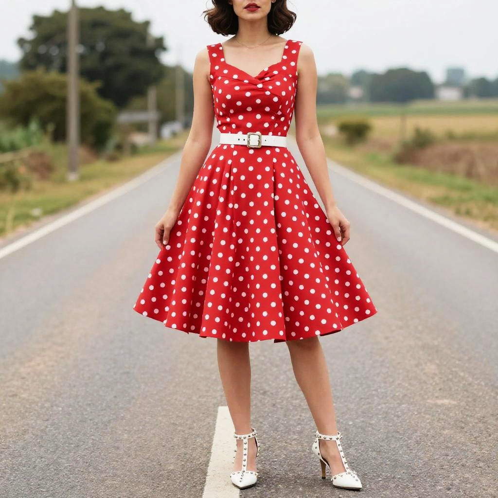 Woman, vintage, sleeveless red dress with white polka dots, knee-length, flared skirt, sweetheart neckline, white belted waist, studded white high-heeled shoes, wavy short hair, standing, country road background.
