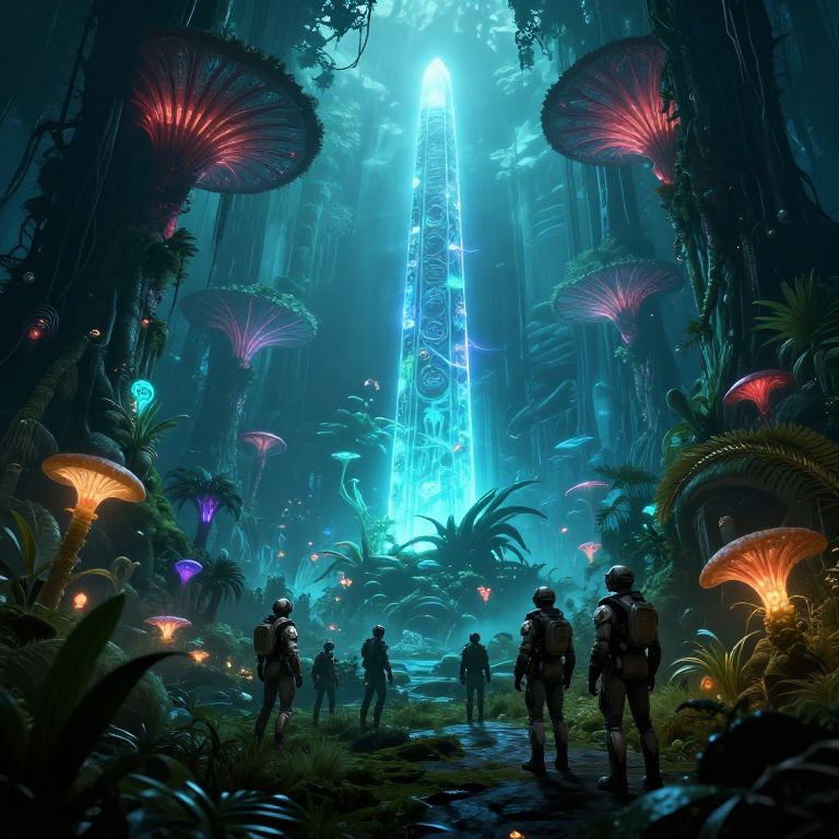 Neumar, a lush alien jungle with oversized bioluminescent plants and strange glowing fauna, a mysterious glowing obelisk at the center, explorers in high-tech suits observing, cinematic sci-fi illustration.