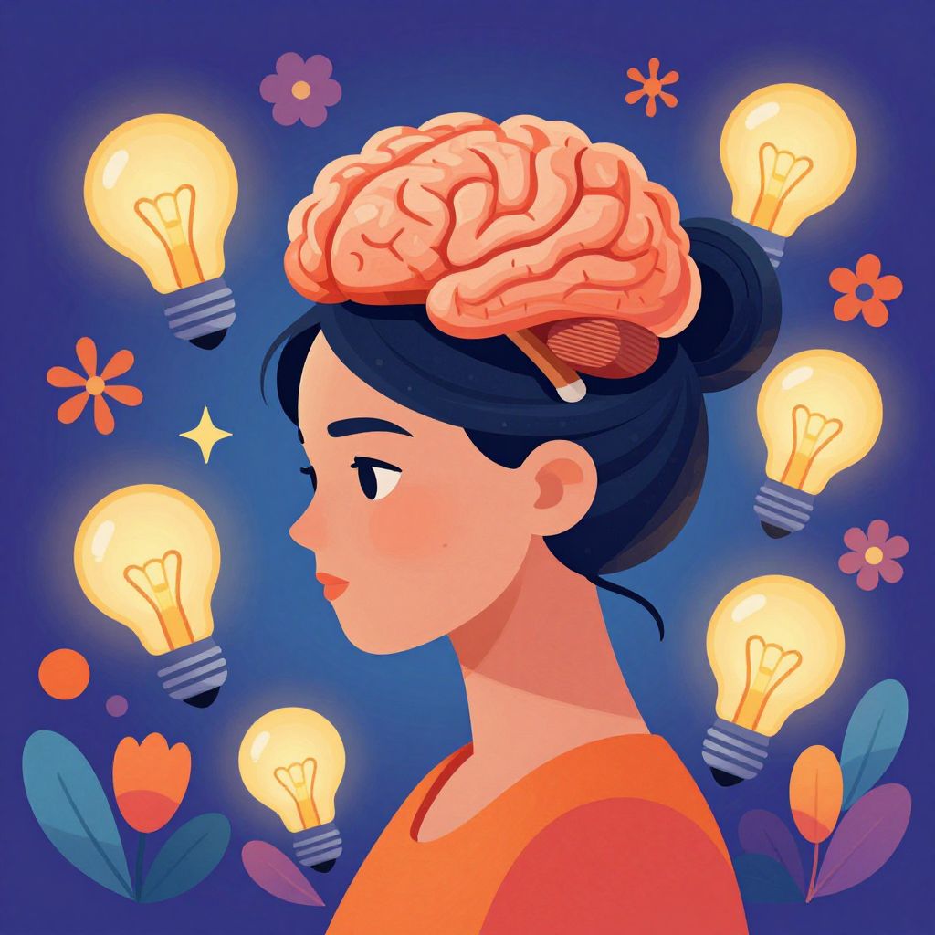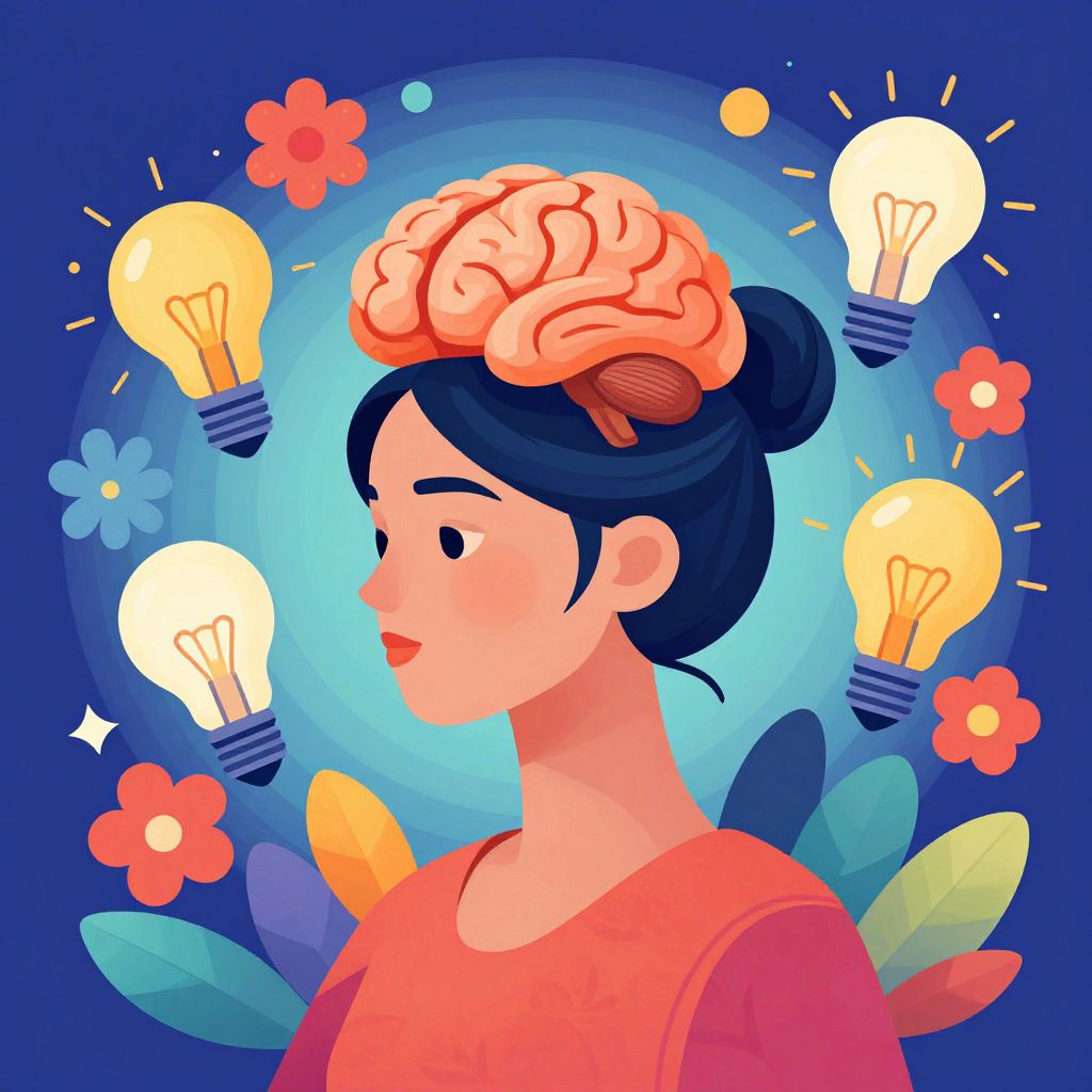 Digital illustration of a woman with a brain on her head, surrounded by glowing light bulbs and colorful flowers on a blue background.