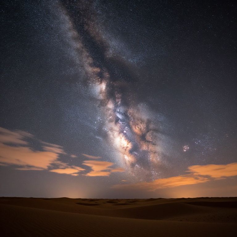 Milky Way cascades across a star-studded night sky above a serene desert landscape, illuminated by soft orange hues near the horizon and dotted with wispy clouds reflecting its celestial glow.