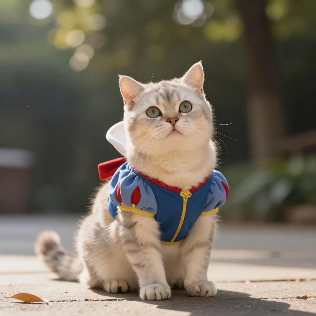 Realistic photo. Cat dressed as a Snow White posing for an image, luminous and whimsical, warm dappled sunlight with fairytale bokeh. realistic photo
