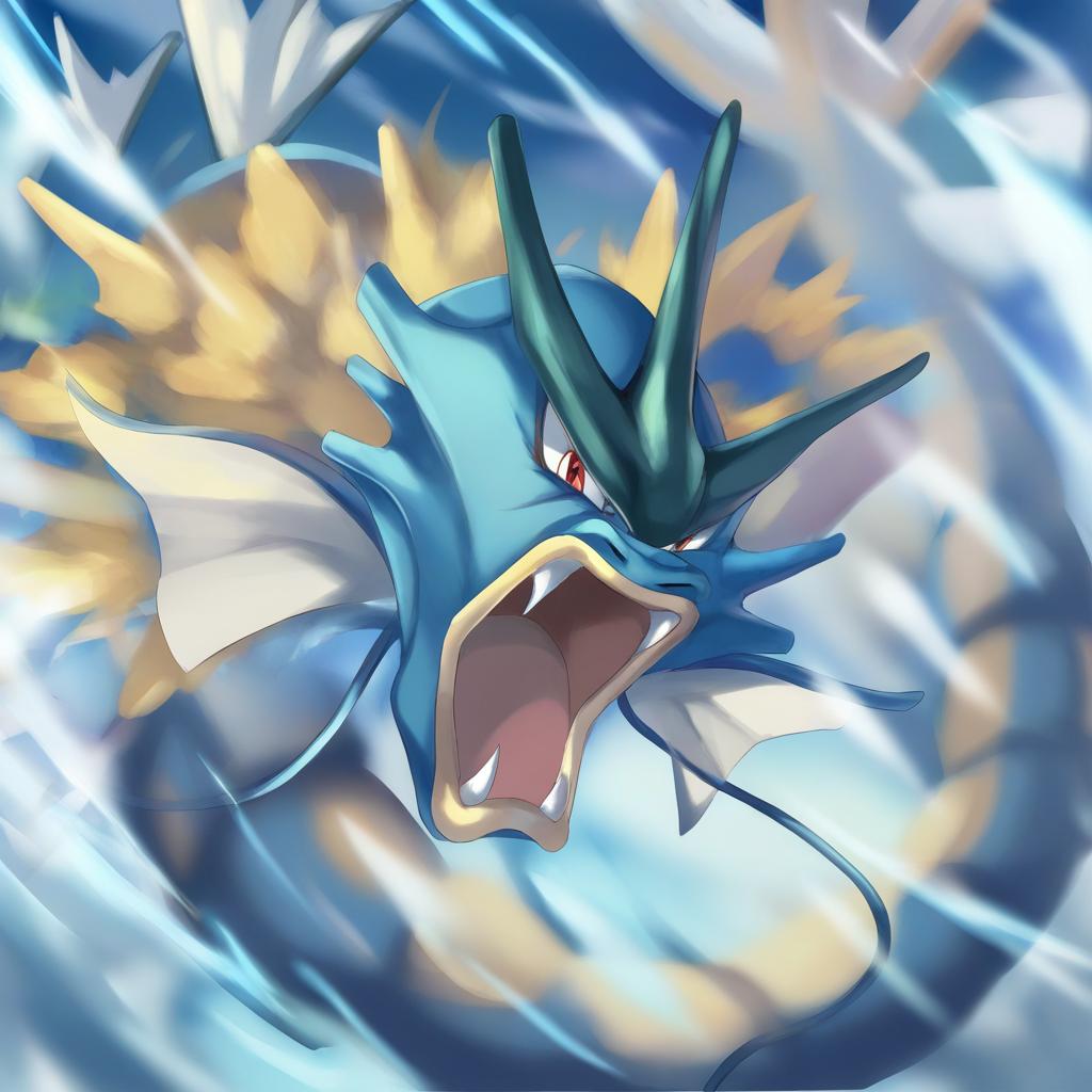Gyarados, pokemon, no humans, fangs, red eyes, long hair, pokemon (creature), by artist harimoji, leet