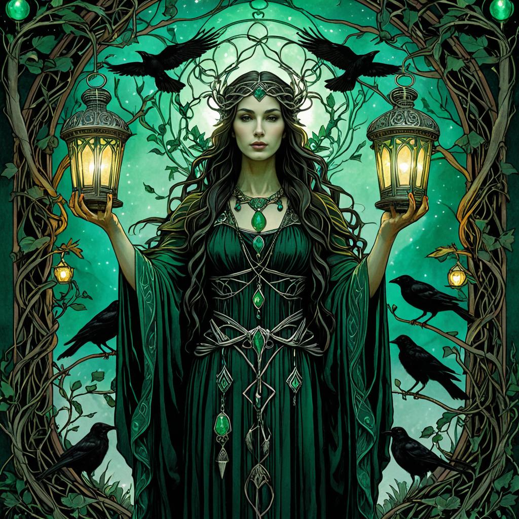 Goddess Hekate, baroque, luminous, 8k, Beeple style, holding floating candles, owls, surrounded by misty veils, luminous runes, digitally vibrant, mystical atmosphere, high detailed, intricate art nouveau design
