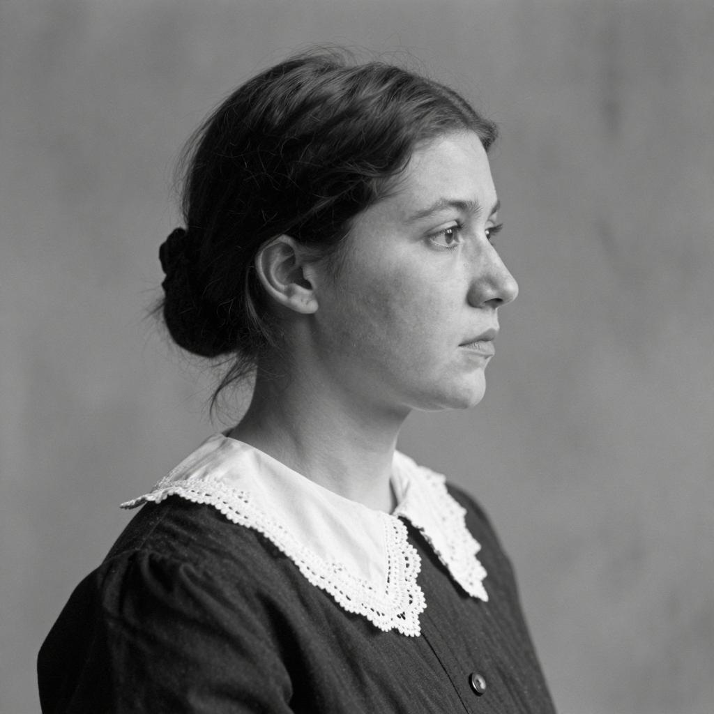 Black and white profile portrait of a light-skinned woman with dark hair pulled back. She wears a dark dress featuring a lacy white collar and has a serious expression. The background is blurred and appears to be a textured wall.