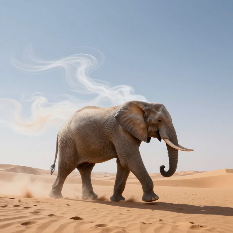 Photograph of a large, gray African elephant with white tusks walking through a bright, sandy desert under a clear blue sky. White smoke swirls
