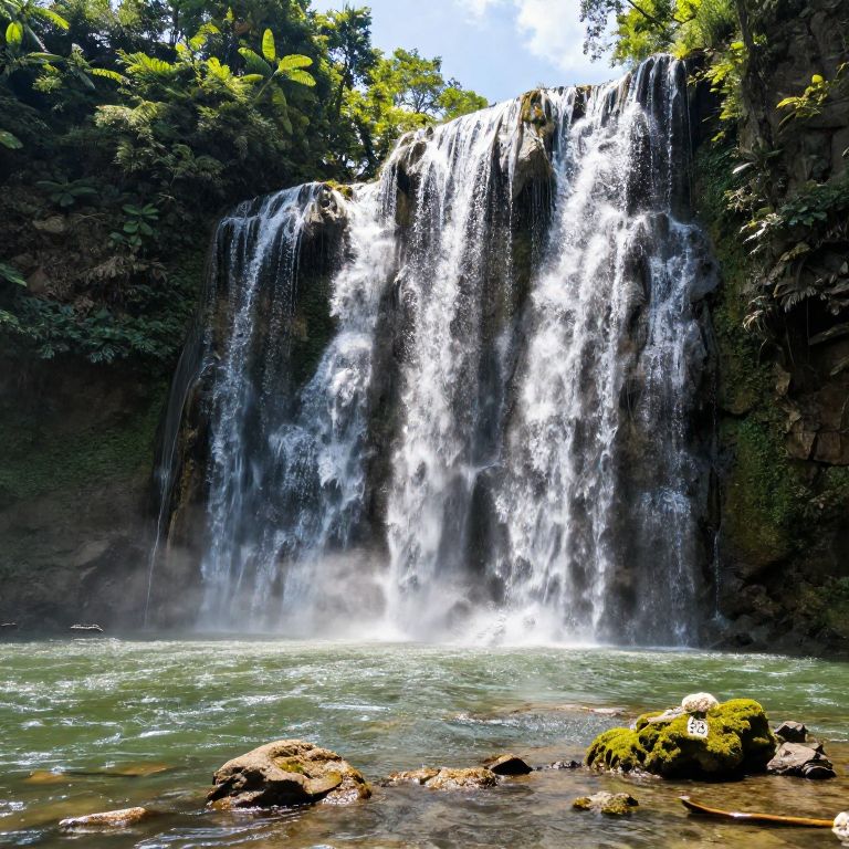 Accessories multiple waterfalls coming together into a pond in the forest with sunny lighting on a nice day,