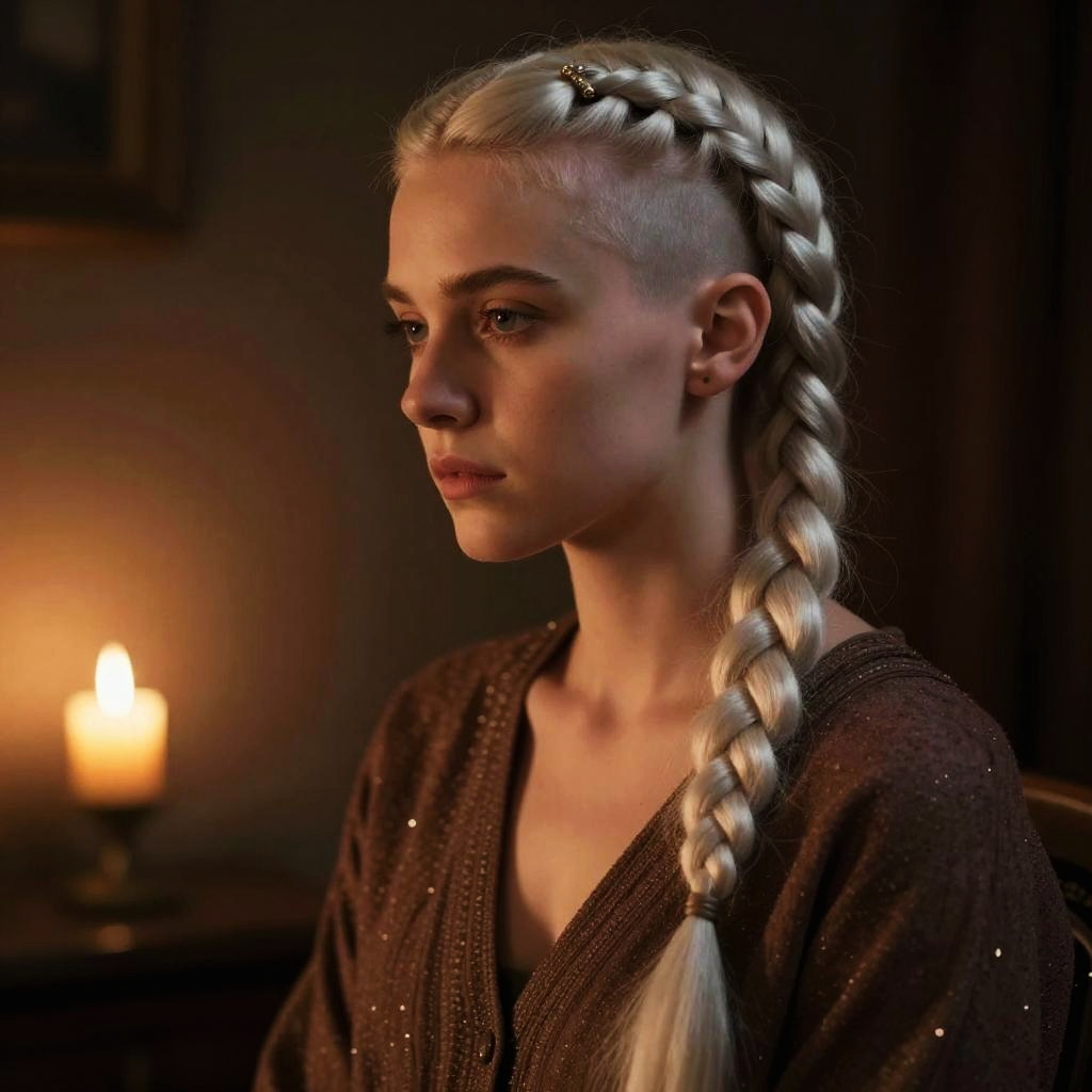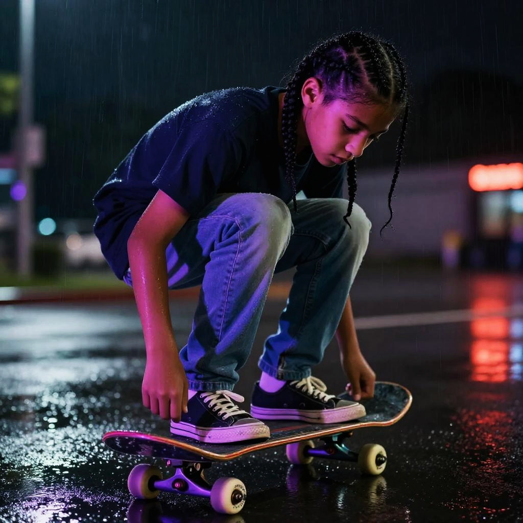 A teenage skateboarder with braided black hair and a worn denim jacket captured in neon rim light with soft urban fog (blue and magenta), surrounded by rich textures and deep focus that evoke emotional depth, inspired by neon-noir cinematic palette fused with the chiaroscuro drama of Caravaggio.