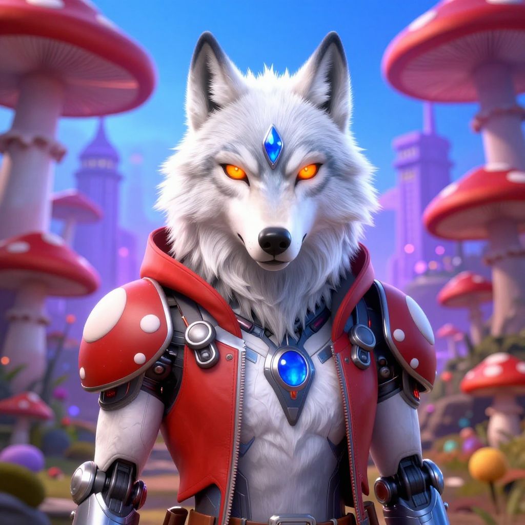 Digital artwork of an anthropomorphic white wolf with glowing orange eyes and a blue gem on its forehead. The wolf wears a red, armored vest with white polka dots and metallic accents, including a blue gem on a chest plate. The background features a vibrant, fantastical forest with large red-and-white mushrooms and a purple-hued, castle-like cityscape. The wolf's fur is detailed and realistic, contrasting with the futuristic armor. The overall style is a blend of fantasy and sci-fi, with a vivid, colorful palette and sharp, clean lines.