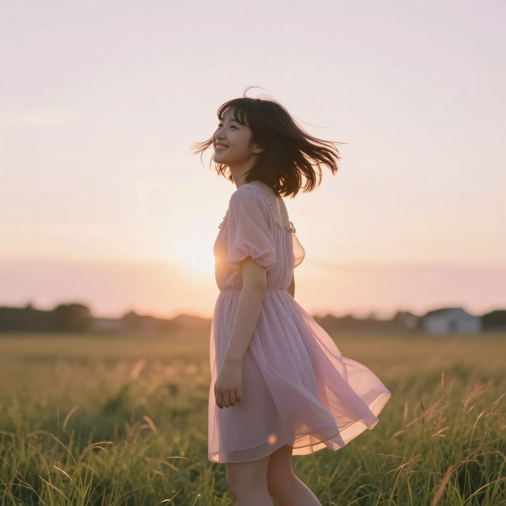 On grass, sunset, golden hour lighting, backlighting, blurry background, (lens flare), wind, pastel colors, soft light, 1girl, floating short hair, happy, from back