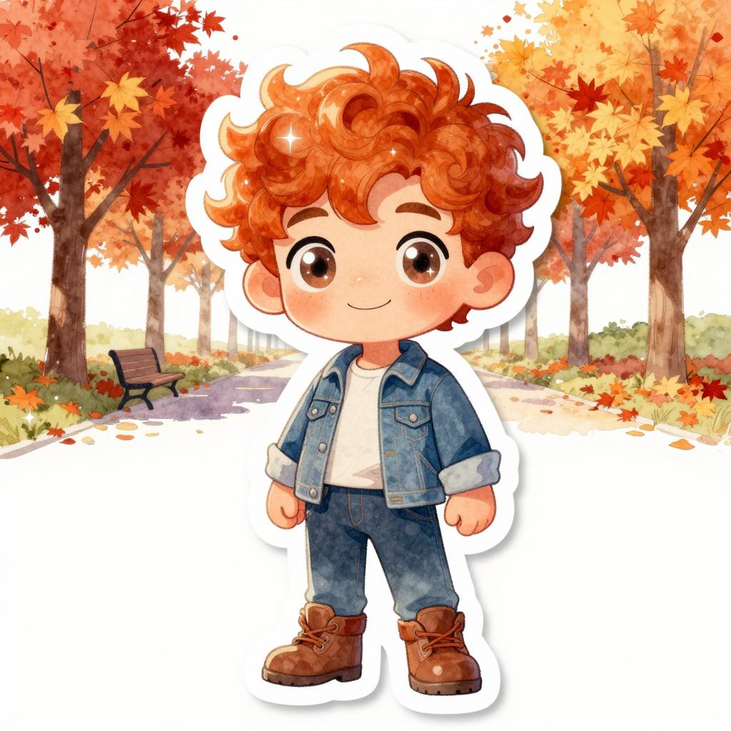 Watercolor anime comic art full-body sticker of young ginger boy with freckles and curly hair wearing denim jeans and boots in autumn park lined with red and orange maple trees, white background, transparent PNG, neon highlights, upscaled, big sparkling eyes, cute smiling face