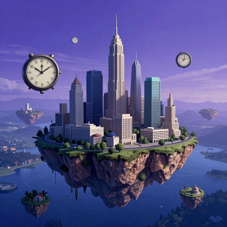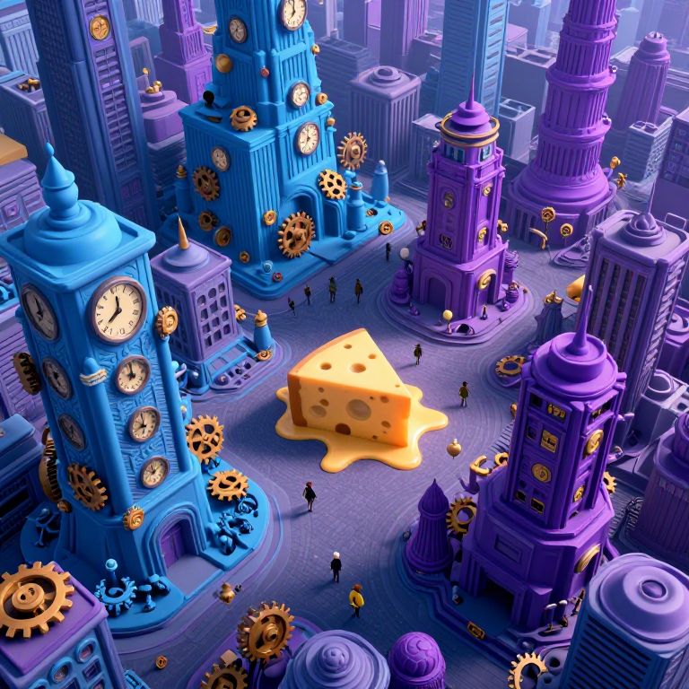 A surreal digital artwork depicting a futuristic cityscape where skyscrapers made of melted cheese and vivid colors dominate the skyline. Viewed from an aerial perspective, this scene showcases a harmonious blend of organic shapes and mechanical structures, with clock faces adorning the buildings' facades reflecting time in an abstract manner. The atmosphere is filled with strange, levitating objects reminiscent of floating clouds, evoking a sense of wonder and curiosity as viewers explore this bizarre, yet captivating world.