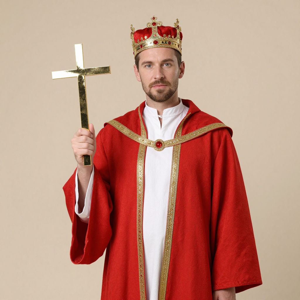 Kings Christmas Costume, man dressed in a red robe and a crown holding a cross