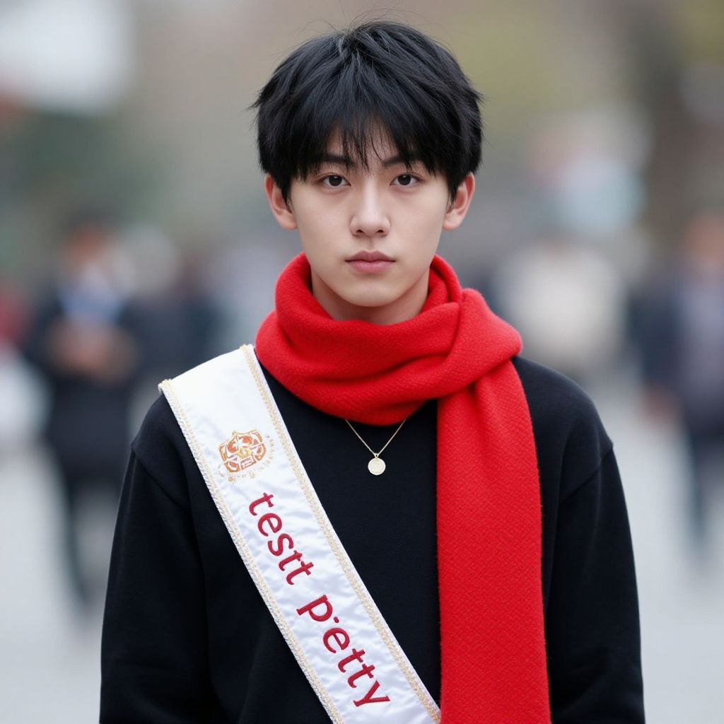 Photograph of an androgynous young Asian model with short, black, slightly messy hair and fair skin. They wear a black button-up shirt, a gold-trimmed black sash with "Supermodel" written in white, and small black earrings. Their expression is neutral. The background is blurred with indistinct people, creating a shallow depth of field. The model's subtle makeup emphasizes their sharp features. The lighting is bright, highlighting their face and sash. The overall style is contemporary, with a focus on fashion and modeling.