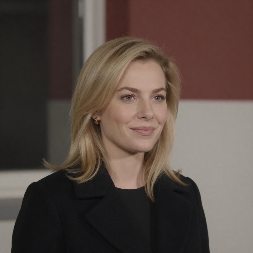 Photograph of a woman with fair skin and blonde hair in an elegant updo. She wears a green dress with a high neckline and a ring on her left hand. Her expression is neutral, slightly serious. She sits with her right hand resting on her chest. Blurred background with dark wood furniture. Another person is partially visible on the left.
