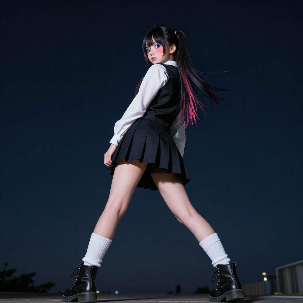 1girl, cute petite, flat chest, starry print eyes, dark multicolored hair, long hair, hime cut, streaked hair, hair pulled back, blush, from below, school uniform, black vest, slouch socks, work boots, From a Distance, __pose__, looking back, contrapposto, dynamic pose, cinematic lighting