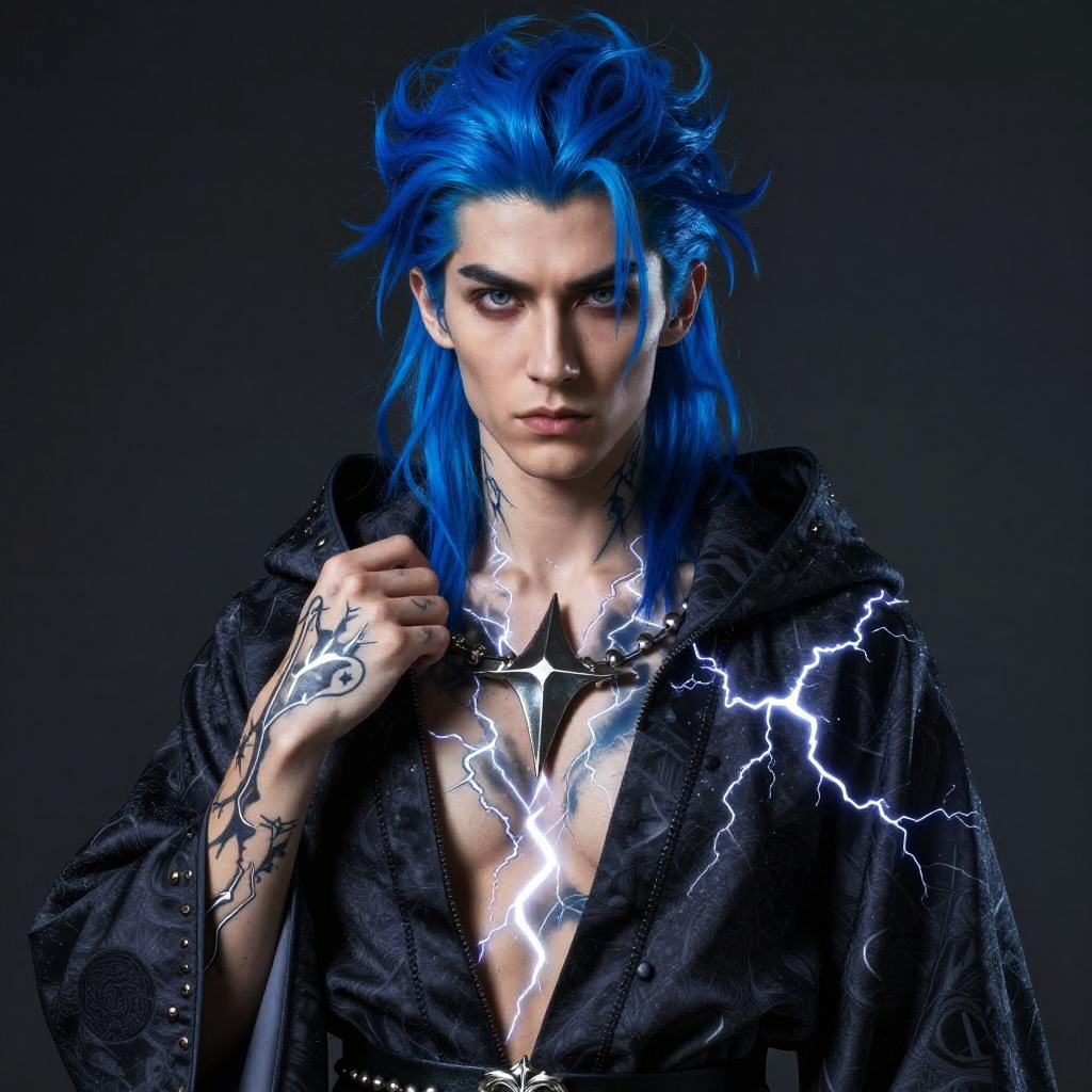 Sleek storm mage, wearing a dark storm-patterned cloak, with crackling silver lightning tattoos, wild electric blue hair, flashy storm gray eyes