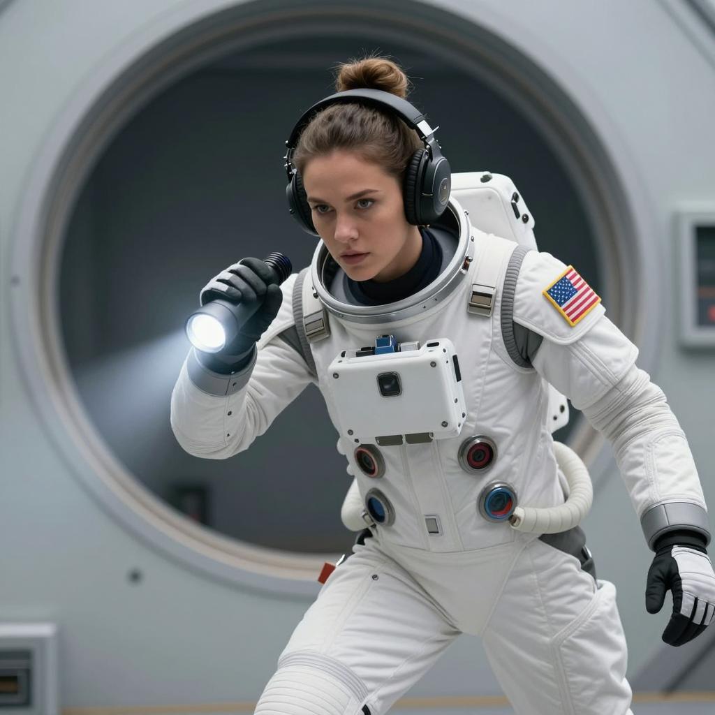 Woman with light skin, brown hair in a bun, wearing a white and black spacesuit with gloves, holding a flashlight in her right hand. She is looking forward with a focused expression. Background has a large, circular, metallic structure. She is in a dynamic, downward-facing pose. American flag patch on her left arm. Black headphones in her ears. Light source from the flashlight illuminates her face.