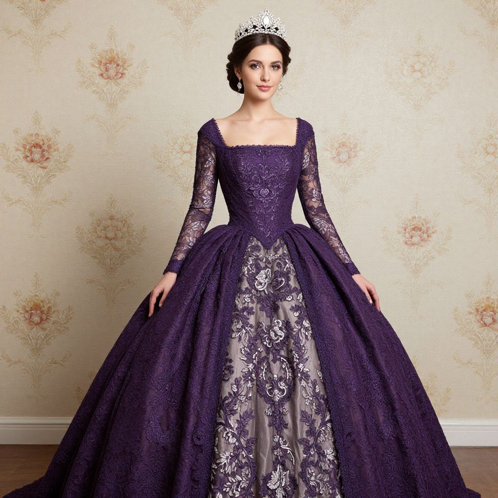 Elegant woman wearing a regal purple baroque-inspired gown with intricate lace detailing, long sleeves, and a voluminous skirt, complemented by a sparkling tiara and floral wallpaper backdrop.