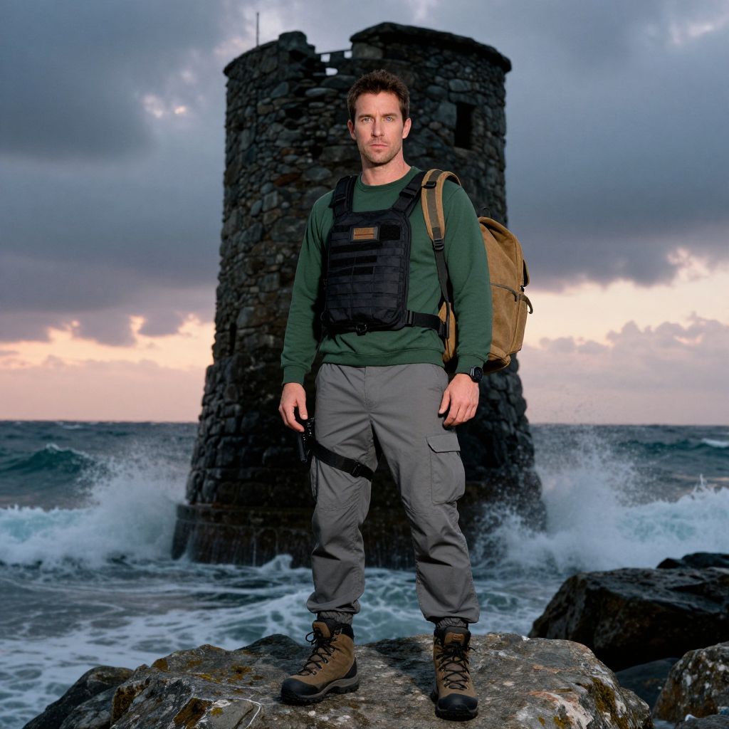 "a man, slate gray tactical joggers, forest green long-sleeve pullover, waterproof hiking boots, black tactical chest rig, brown canvas backpack, rustic stone tower, crashing waves below, dramatic sunset sky, 3M analog film stock, determined expression. Man has masculine face and piercing eyes"