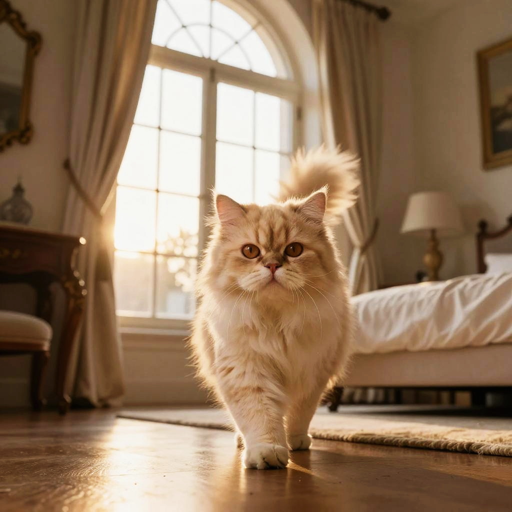 Long-haired cream Persian cat with deep amber eyes confidently walking toward the viewer across elegant bedroom with silk drapes and antique wooden furniture, lit by golden sunset light spilling through large arched windows. Natural textures of fur, fabric, and wood emphasized; inviting and homey atmosphere; shallow depth of field; crisp whiskers; soft vignetting; balanced composition; subtle film grain; realistic color rendering; gentle contrast; fine detail throughout.