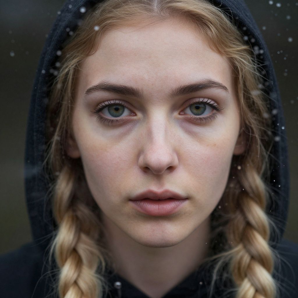 This is a highly detailed, close-up photograph of a young woman with fair skin and blue eyes. She has light blonde hair styled in two braided pigtails. She is wearing a black hooded garment with snow gently falling around her. Her expression is neutral, with slightly parted lips and minimal makeup, showcasing her natural features. The background is dark and blurred, emphasizing her face. The image has a realistic, slightly dramatic style, with a focus on her intense gaze and the soft texture of the falling snow.