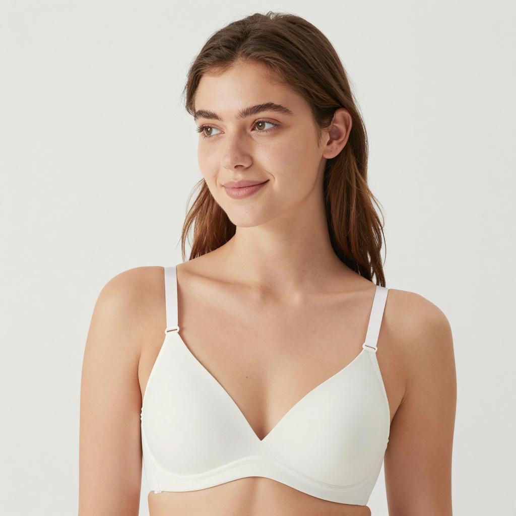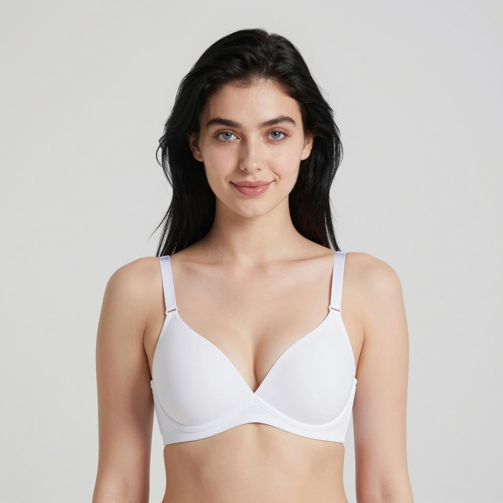 Photograph of a young woman with long brown hair, wearing a beige bra with underwire, large dark earrings, and sunglasses on her head. She has a fair complexion, smiling slightly, and looking downward with her right hand near her face. Background is blurred green.