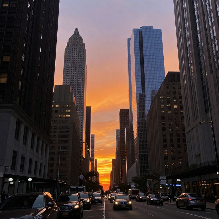 Amidst the concrete jungle, the Manhattanhenge sunset casts a fiery embrace over the city, evoking a profound sense of transience and connection as the golden light unites the towering skyscrapers and the silent procession of cars below, while the cool evening air carries whispers of both solitude and collective dreams.
