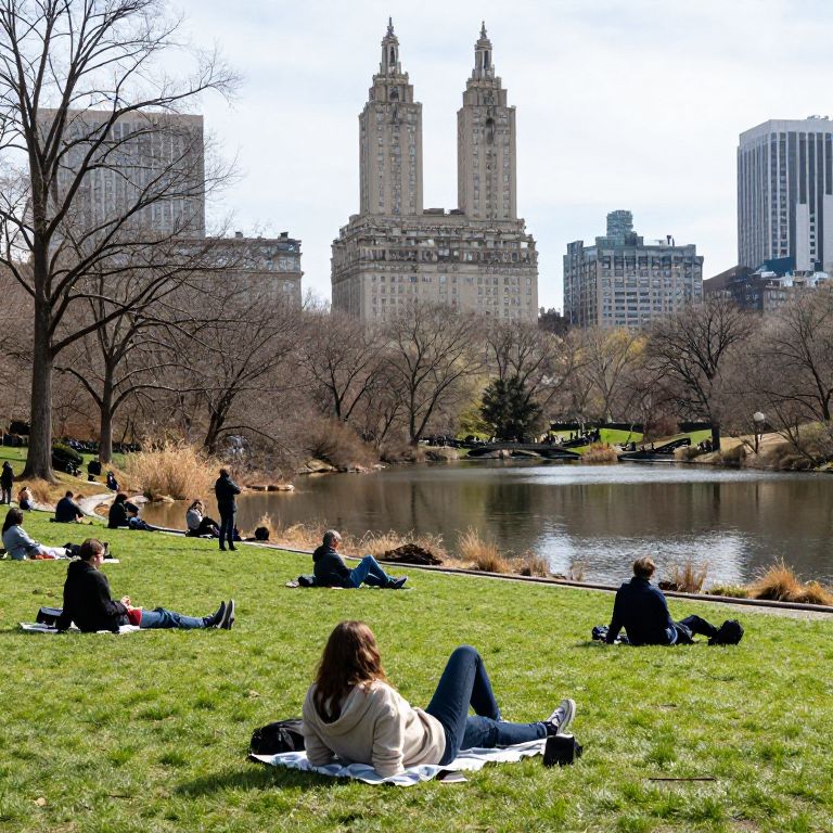 People relax and enjoy a serene early spring day by a tranquil pond in Central Park, surrounded by lush green grass, bare trees, and the iconic Manhattan skyline in the background.