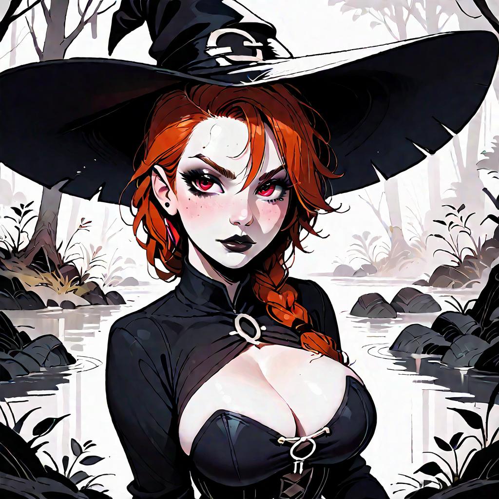 Score_9, score_8_up, score_7_up, score_6_up, score_5_up, score_4_up, rating_questionable, portrait, staring at viewer, witch, red hair, braided ponytail, (snub nose, full lips:1.1), nose ring, witch hat, black dress, corset, deep cleavage, (boob overflow, large breasts:1.1), annoyed expression, (raised eyebrow:1.1), pierced, dark makeup, goth, in the woods, swamp, nature, erotic, 8k