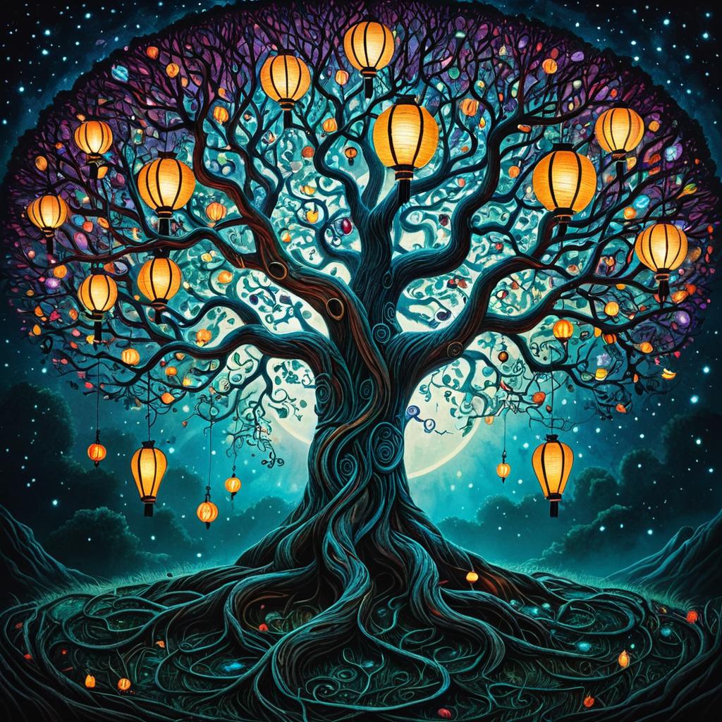Surrealistic depiction of the Tree of Life, vibrant and otherworldly, spiraling branches intertwined with floating lanterns, dreamlike atmosphere, mysterious and enchanting, high quality, detailed surrealism, magical realism, whimsical colors, ethereal lighting, mystical infusion