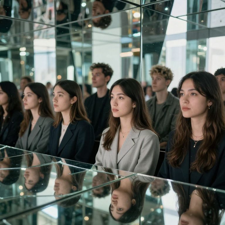 Photograph of a group of five young adults standing in front of a large, mirrored wall. The front two women, with long brown hair and light skin, are in focus; the woman on the right wears a light grey blazer, while the woman on the left wears a black blazer. Behind them, three men with varying hairstyles and light to medium skin tones, dressed in dark clothing, are slightly blurred. The reflections in the mirror create a repetitive, symmetrical effect. The background is brightly lit, suggesting an indoor, modern setting. The image has a sharp focus on the foreground subjects.
