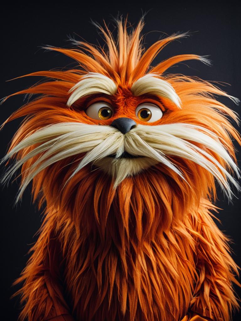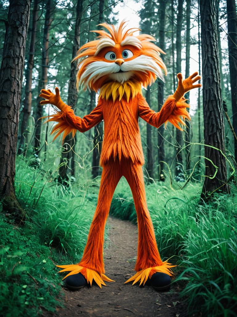 Man in Lorax Costume, full-body cosplay photo in fantasy forest backdrop