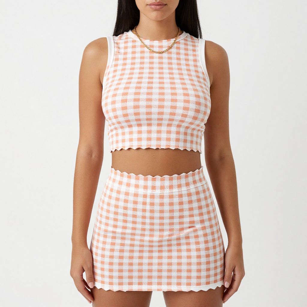 Photograph of a woman with straight black hair, showing from neck to upper thighs, wearing a sleeveless, white and red gingham checkered crop top and matching mini skirt. The top has scalloped edges at the bottom and midriff, while the skirt has similar scalloped edges at the hem. She wears a simple gold necklace. Her skin tone is light brown, and she stands against a plain white background. The outfit is fitted, highlighting her slim waist and curves. The gingham pattern consists of small red squares on a white background.