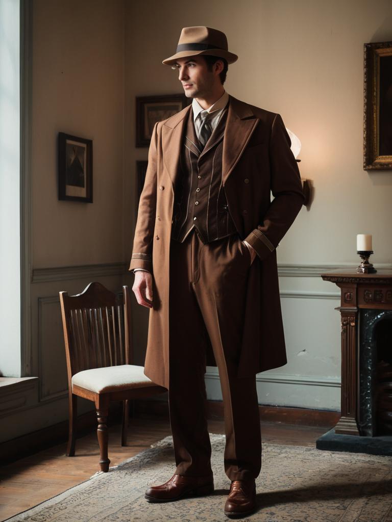 Gotham Gaslight Costume, man in a brown suit and hat standing in a room --sref 1390