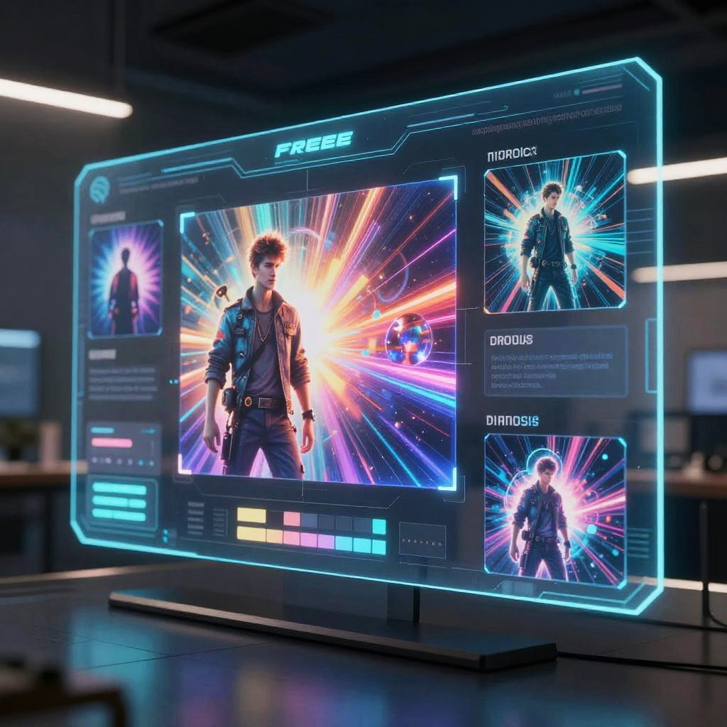 Free image generator concept, futuristic digital art interface with vibrant color palette, glowing holographic screens displaying dynamic image creation, sleek modern design, high detail, cyberpunk ambiance, 4k resolution, realistic lighting effects