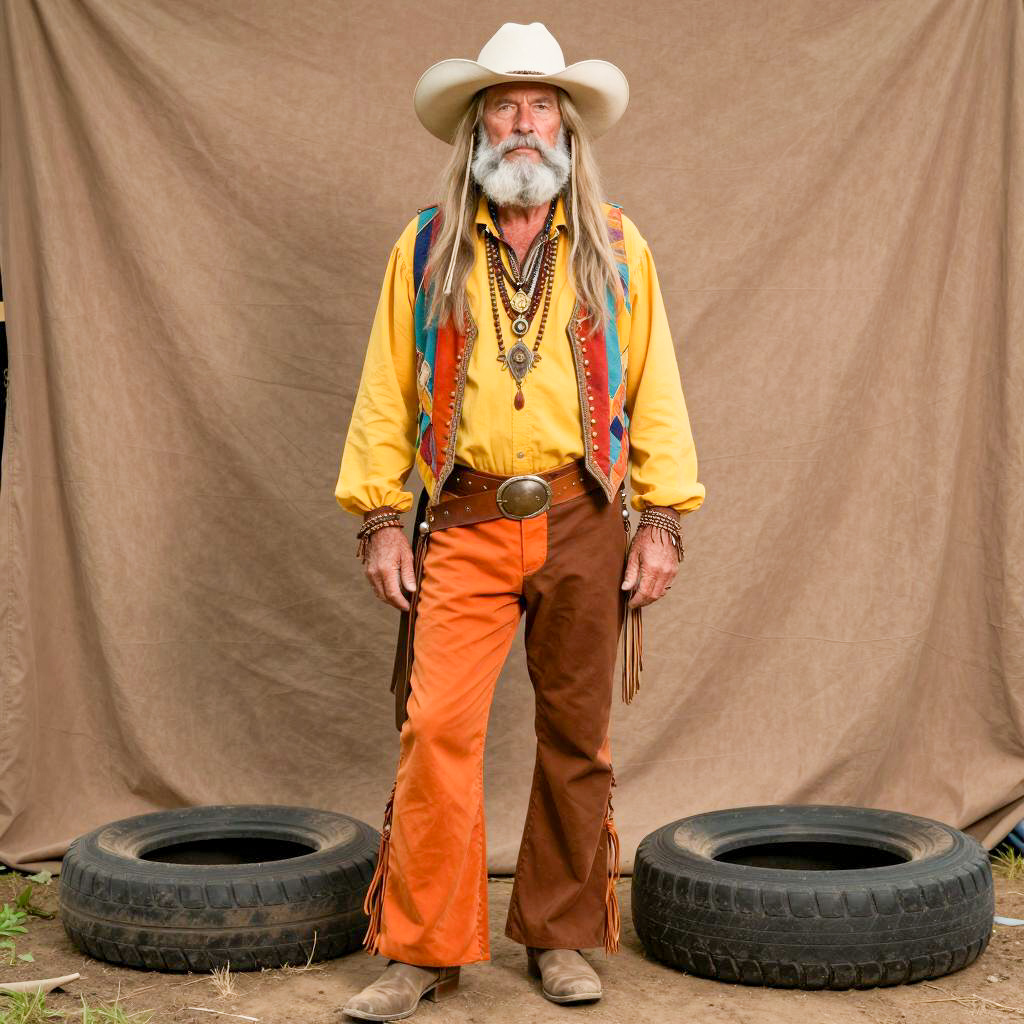Funny caveman costume, photograph of an old man, standing in front of large rock formation, Native American style clothing, sleeveless beige shirt, long brown beard, long hair, brown and tan striped skirt, arm bands, brown leather strap over shoulder, grass at bottom, sunlight, realistic, detailed ures, realistic lighting, daytime, outdoors