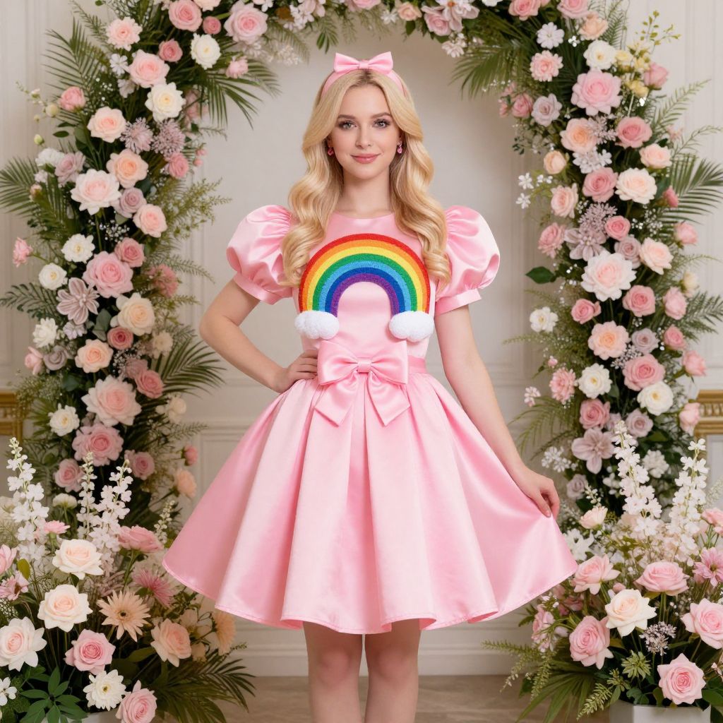 Photograph of a young woman with long, wavy blonde hair and fair skin, wearing a pink, puffed-sleeve, knee-length dress with a rainbow and cloud graphic on the chest. She has a pink bow headband and stands in front of a floral archway adorned with pink and white roses, green foliage, and small white flowers. The background is a white, ornately paneled wall. She smiles gently, with her hands resting on her hips, exuding a cute, whimsical vibe. The image has a bright, airy feel, with soft lighting enhancing the pastel colors and floral details.