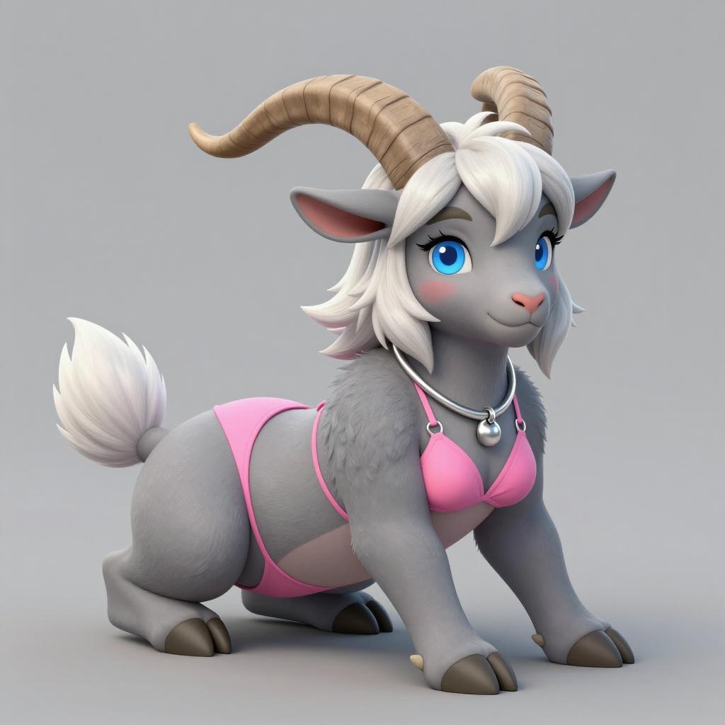 Digital artwork of a gray anthropomorphic female goat character with large curved horns, white hair, blue eyes, and pink blush. She is lying down in a pink bikini with a silver necklace and bracelet. The character has animal features including goat ears, paws, and a tail, blending human and goat traits in an anime-inspired style.