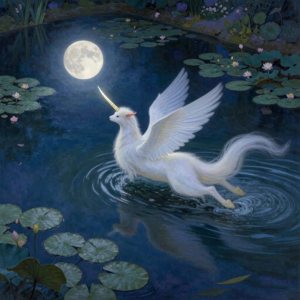Imagine a tranquil moonlit night in an enchanting garden, evoking the serene beauty of impressionist landscapes. A majestic creature gracefully glides across the surface of a still pond, its luminous horn reflecting the soft moonlight. The scene is captured from above, highlighting the ethereal elegance of the being against the backdrop of lily pads and gently rippling water, creating an otherworldly atmosphere that blends the magic of fantasy with the dreamy charm of impressionistic artistry.