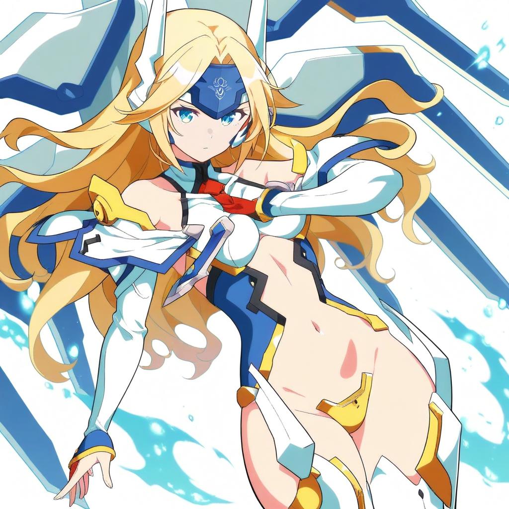 Mu-12, blazblue, 1girl, blue eyes, long hair, blonde hair, navel, thighhighs, mecha musume, crotch plate, forehead protector, by artist arano oki, leet