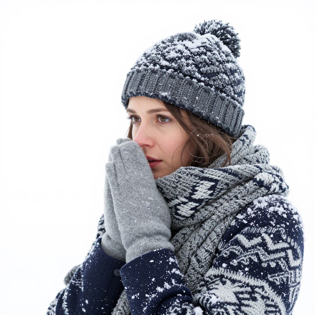 Photograph of a young woman with fair skin and brown eyes, wearing a gray knitted beanie with a black and white pom-pom, gray knitted gloves, and a black and white patterned winter coat. She is covering her mouth with her gloved hand, looking slightly to the side with a thoughtful expression. Snowflakes are visible on her hat and coat. The background is pure white, emphasizing the winter theme. The image has a high-contrast, crisp quality.