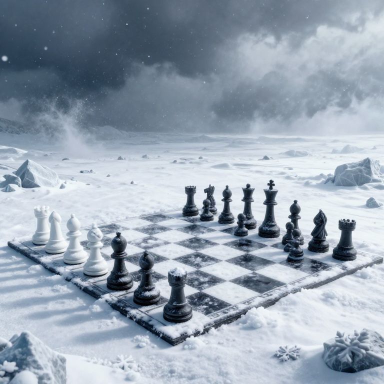 Digital artwork of a snow-covered chessboard with black and white pieces, set on an icy landscape under a dramatic, cloudy sky.