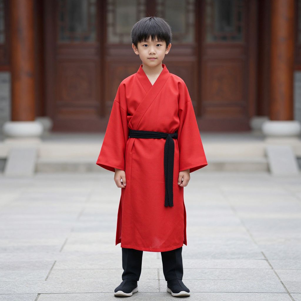 Photograph of an Asian boy with straight black hair, wearing a bright red karate gi with black belt, black pants, and white shoes, standing
