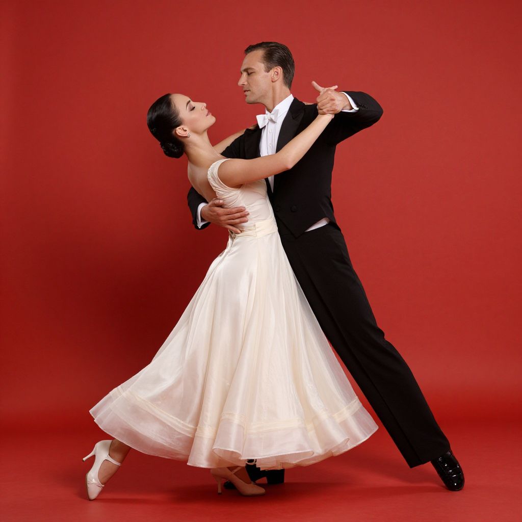 Elegant couple poised in a formal dance pose, featuring a woman in a flowing cream gown and a man in a classic black tuxedo, set against a vibrant red backdrop.