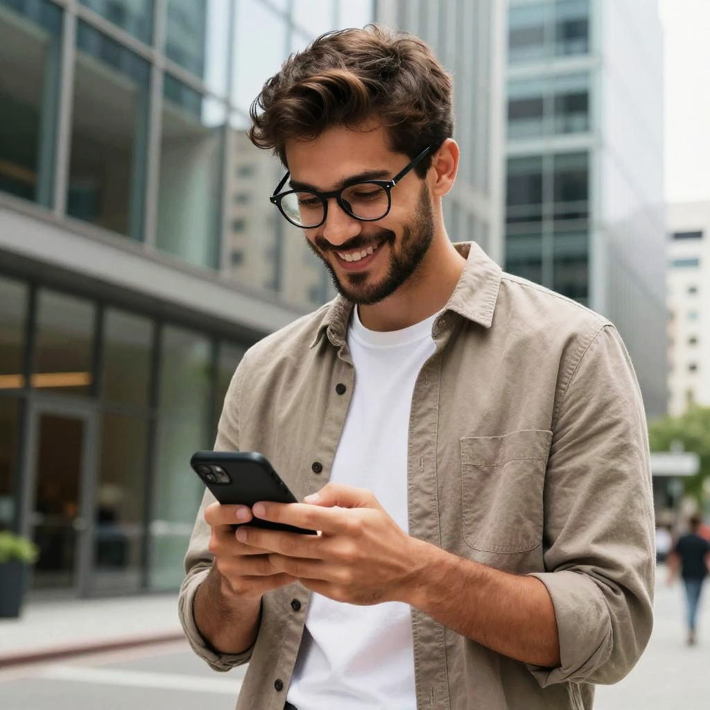 A young man with glasses and beard smiling while looking at his phone, wearing a light brown button-up shirt over a white t-shirt, standing outdoors in front of modern glass buildings, natural daylight, candid and warm atmosphere