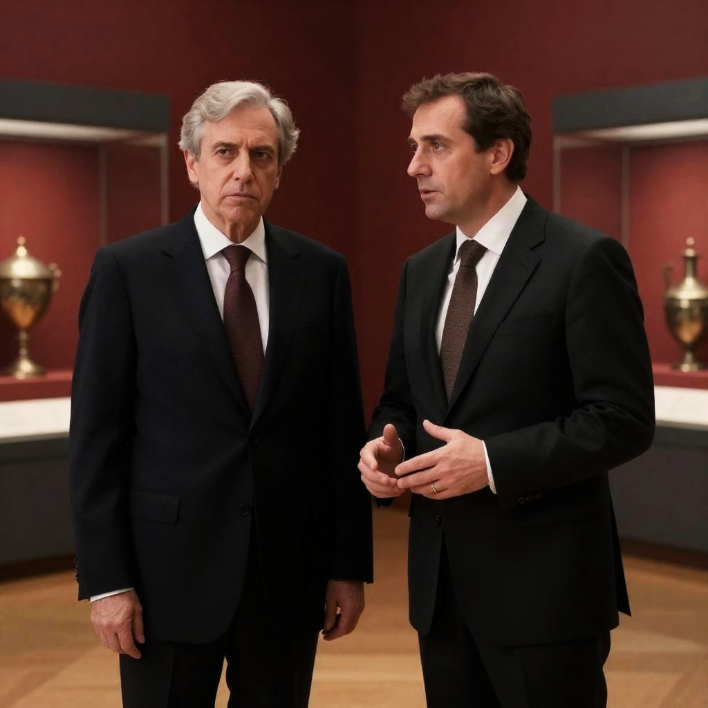 Two middle-aged men in suits, standing in a museum-like setting. The man on the left holds a black coat, gray hair, serious expression. The man on the right, black suit, white shirt, brown tie, gesturing with hands, focused expression. Background includes display cases with metallic objects, red walls.