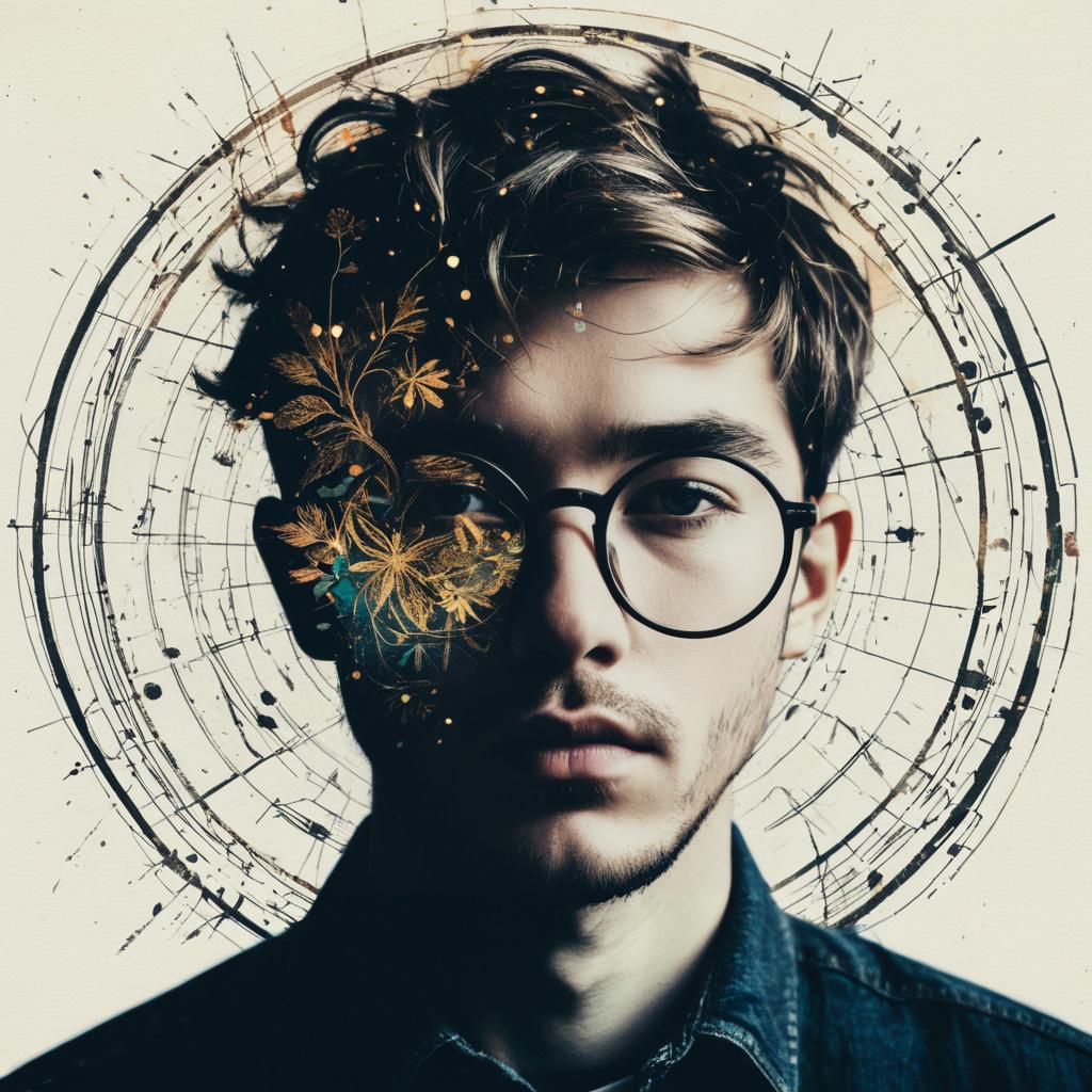 Mysterious silhouette of a young man wearing round glasses, by Carne Griffiths, amazing depth, double exposure, vintage collage elements, bokeh, perfect balance, artistic photorealism, smooth