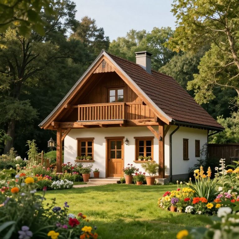 Landhaus style cozy cottage nestled in a lush green countryside, wooden beams, slanted roof, surrounded by colorful flower gardens and tall trees, soft sunlight casting warm shadows, charming rustic details, peaceful serene atmosphere.